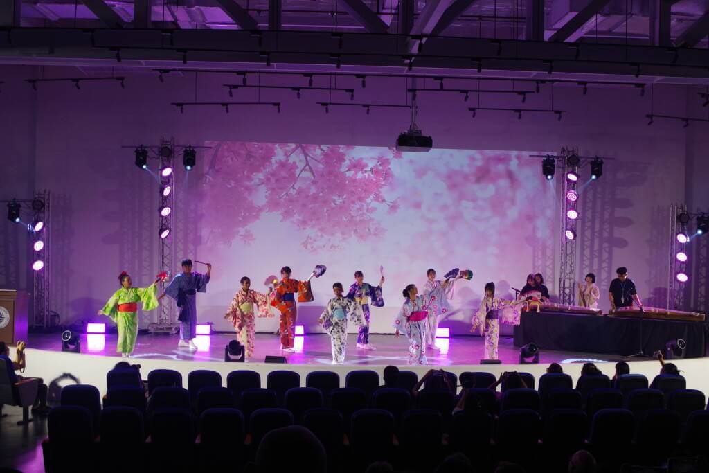 続いて、学生たちと花響(Hanayura)がコラボレーションした「さくらさくら」の演奏と踊りが披露されました。箏の音色に合わせ、浴衣姿の学生たちが扇を手に舞い、日本の春の情景を会場に届けました。