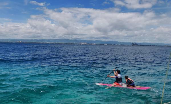 さてこちらは親子でパドルサーフィン。お父さん、頑張ってます!本来立って乗るパドルサーフィンですがこの日は台風の影響で波が強く、ちょっと難しいコンディションでした。
